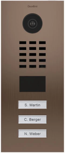 The Doorbird D2102BV video door intercom for 2 Tenants, 2 Buttons, Bronze-Finish allows users to see and speak to anyone who rings the doorbell, at any time and at any distance thanks to the built-in IP camera, directly to their smartphone or tablet. Family members can use the built-in RFID as a door key.