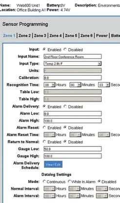 Six zone inputs allow for connection of normally open, normally closed, 2.8K or 10K thermisters and 4-20mA sensors. The WEB600 also has built in power failure monitoring.